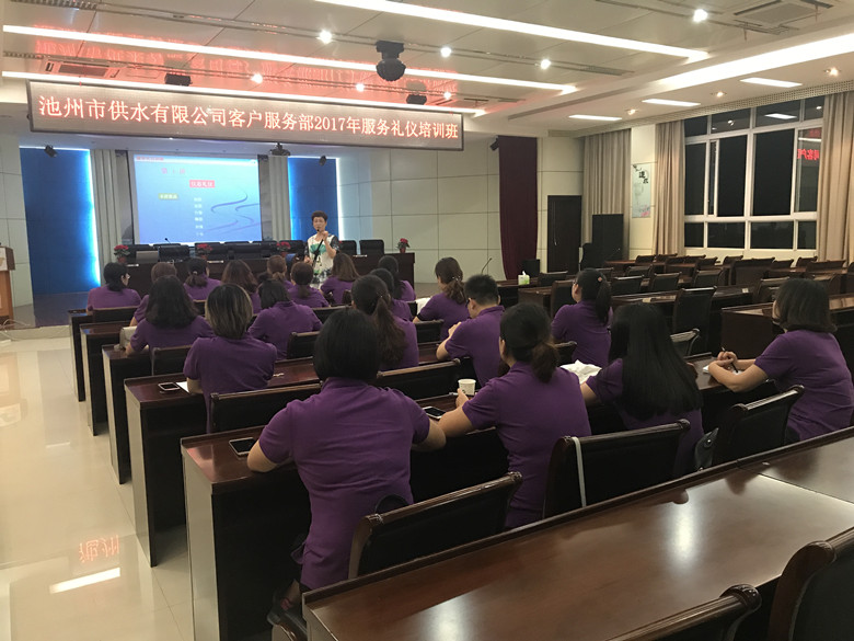 為塑造公司窗口部門的儀容儀表和精神面貌,進一步規范服務行為,提高服務水平,打造服務標桿窗口,池州市供水有限公司于2017921日晚,在四樓會議室舉辦了服務禮儀培訓。此次培訓邀請了池州學院商務禮儀張利萍老師主講,公司客服中心、各營業所、熱線辦等20多名窗口服務人員參加培訓。