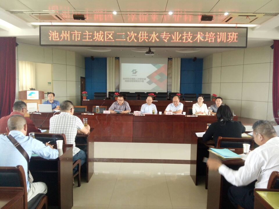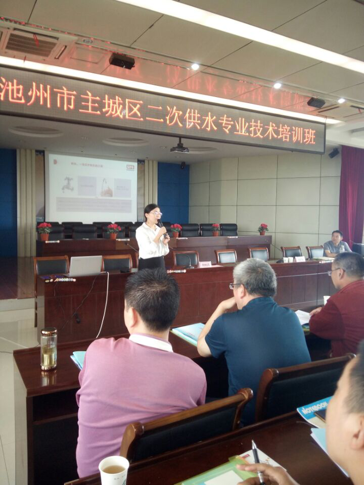培訓開始前池州市供水有限公司總經理吳小平介紹了當前主城區(qū)二次供水總體現(xiàn)狀以及加強二次供水泵站管理的重要性,為破解二次供水行業(yè)難題,2014年池州市政府頒布實施了《池州市市區(qū)二次供水管理辦法》,池州市供水有限公司受市公用事業(yè)局的委托負責新建二次供水泵站的管理工作,主城區(qū)二次供水設施從設計到建設、維護、管理逐步走向了規(guī)范化。但一些老舊小區(qū)未移交的二次供水泵站管理堪憂,水質二次污染風險高,提高物業(yè)單位二次供水設施的管理水平非常必要。