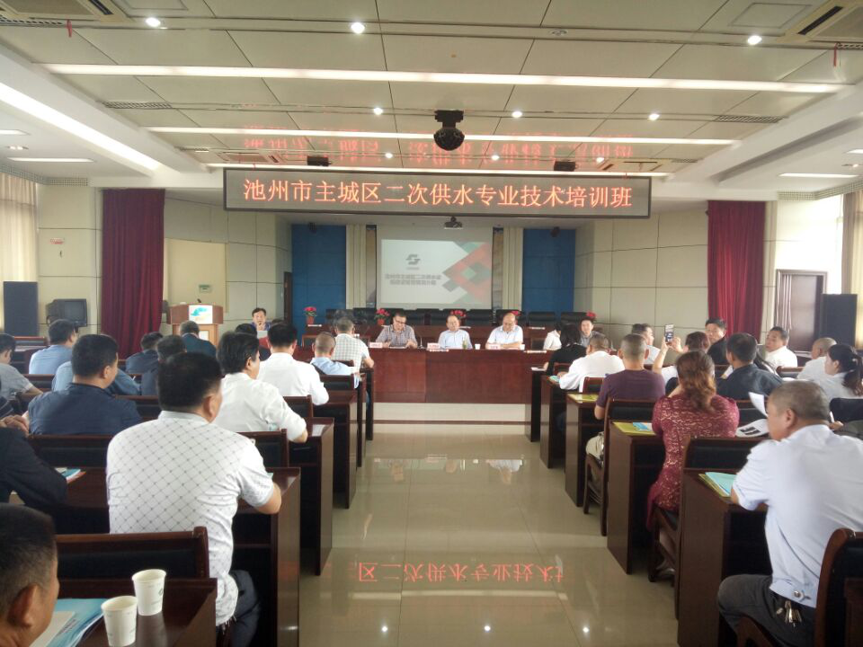 為普及二次供水設施維護管理知識,保障主城區(qū)二次供水安全優(yōu)質供水,2017年9月22日上午9時,首次池州市主城區(qū)二次供水專業(yè)技術培訓班在池州市供水有限公司開班,本次培訓由池州市公用事業(yè)局、池州市房產事務局主辦,池州市供水有限公司承辦。來自池州市主城區(qū)、青陽、石臺、東至70多家物業(yè)公司共計80余二次供水泵站管理人員參加本次培訓。池州市供水有限公司總經理吳小平主持本次培訓,池州市公用事業(yè)局局長李應友、池州市房產局物業(yè)科科長吳立宏出席了開班儀式。