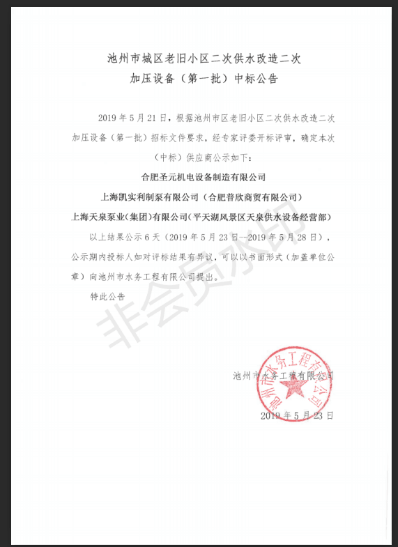| 池州市城區老舊小區二次供水改造二次 加壓設備(第一批)中標公告 | |