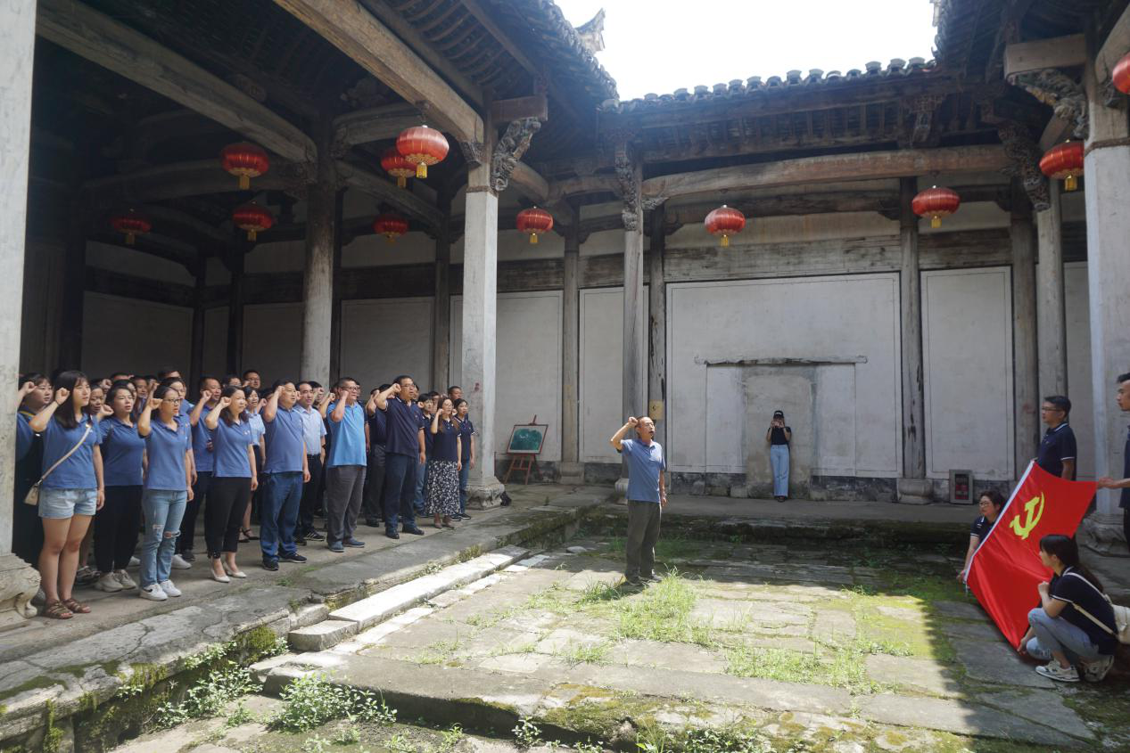 參觀完家風家訓館后,大家前往陵陽鎮(zhèn)北上抗日先遣隊駐地舊址。這里既是陳氏宗祠也是抗日先遣隊駐地舊址,1934年12月,紅軍北上抗日先遣隊曾在此宿營,司令部就設在陳氏宗祠中。大家認真觀看一組組珍貴的歷史圖片和文獻資料,體會這棟古建筑里不屈不撓艱苦奮斗的時代痕跡,切身感受革命先烈對黨忠誠、無私奉獻、不懼犧牲的革命精神,全體黨員深受震撼,思想上受到一次深刻的洗禮。最后,在供水公司黨支部書記鐘誠的帶領下,全體黨員一道舉起右拳、面對黨旗、莊嚴宣誓。“我志愿加入中國共產黨,擁護黨的綱領,遵守黨的章程……永不叛黨。”一字一句,鏗鏘有力,愛國愛黨之情油然而生。