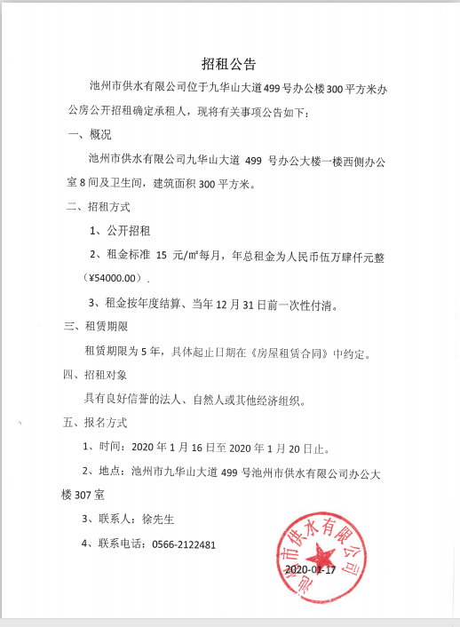 ----------------------------------------------------------------------------------- 上一篇:流標(biāo)公示 下一篇:池州供水營(yíng)業(yè)廳暫停營(yíng)業(yè)的通知 |