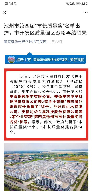 池州市市長質量獎的評選旨在通過樹立質量先進典范,提升我市質量競爭力和經濟綜合實力,每兩年評選一次,每屆獲“市長質量獎”的企業不超過兩家,獲“市長質量獎提名獎”的企業不超過5家。本屆池州市市長質量獎是池州市高質量發展戰略實施以來的第四屆,共選出2個市長質量獎和4家提名獎企業。面對榮譽,池州供水公司負責人強調,殊榮是對我們過去工作的肯定,更是對我們未來目標的鞭策,我們要不忘初心、牢記使命,堅定不移走高質量發展之路,堅定不移以卓越績效為引領,全面深化公司高品質管理與運營,為建設“三優池州”做出更大更優的貢獻。