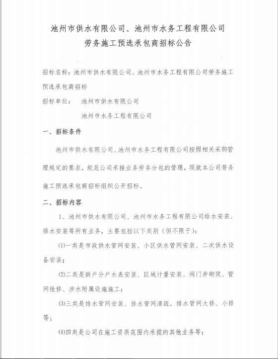 池州市供水有限公司、池州市水務工程有限公司勞務施工預選承包商招標公告