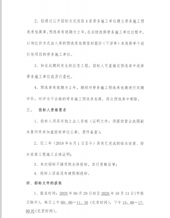 2、擬通過公開招標方式選取4家勞務施工單位建立勞務施工預選承包商庫,預選庫有效期為2年,在后續選擇勞務施工單位過程中,以詢比價方式由入庫的預選承包商密封報價(下浮率)來選擇單個或打包項目的勞務施工單位。