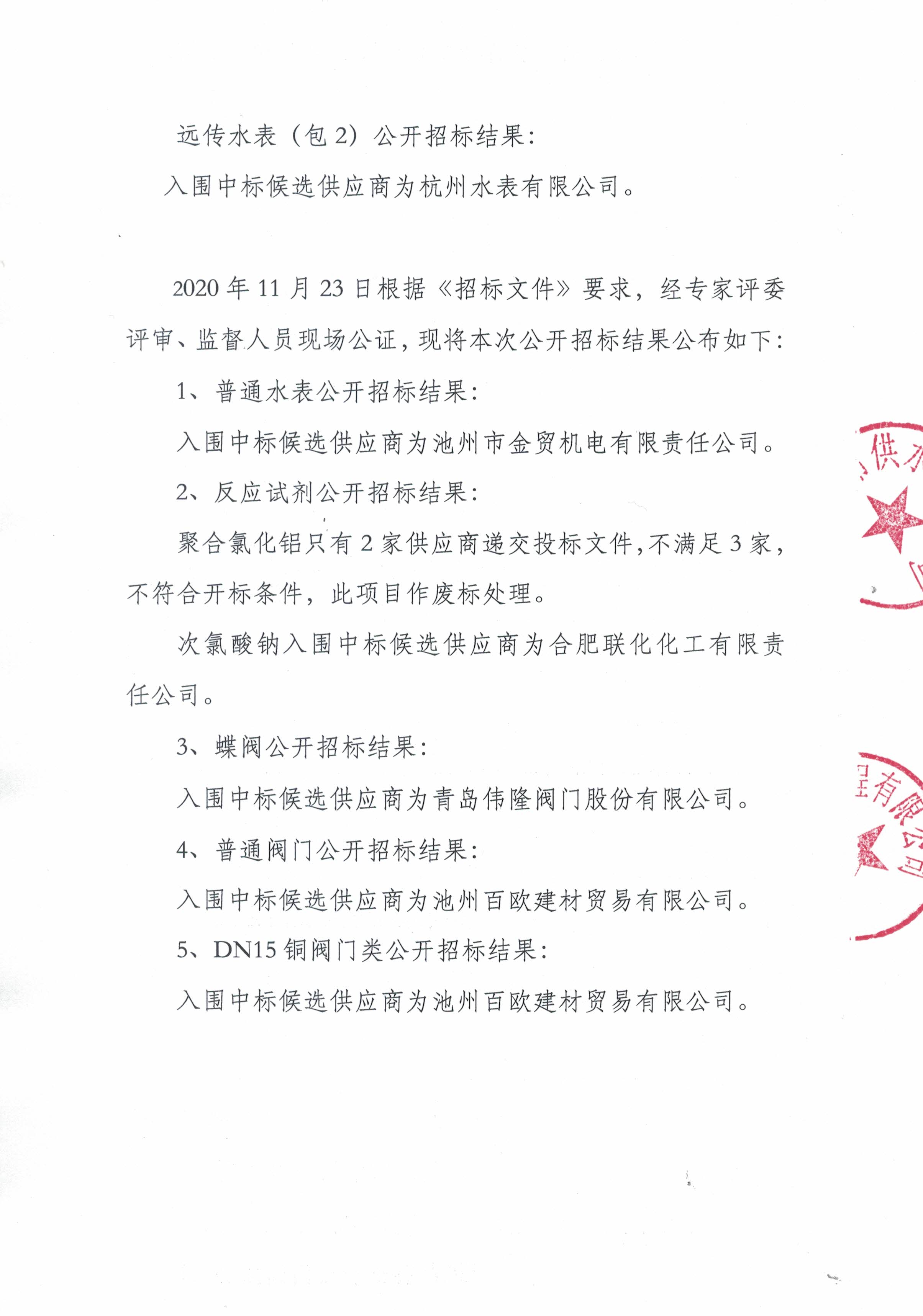 | 池州市供水有限公司、池州市水務工程有限公司2021-2022年度8項大宗物資公開招標結果公示 | |