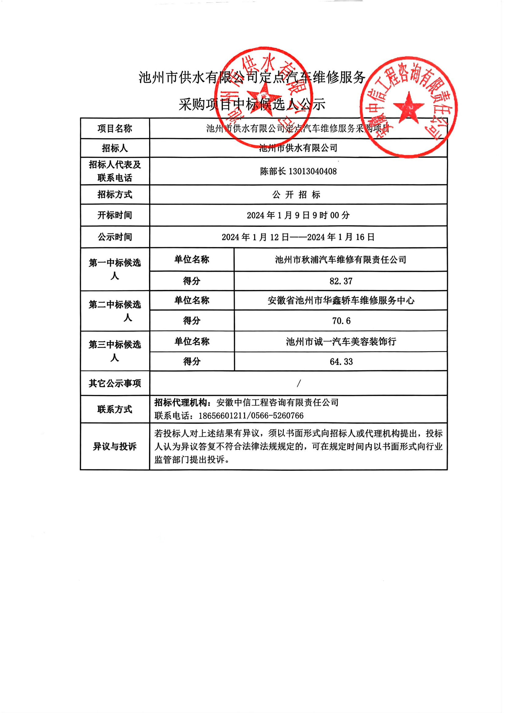 | 池州市供水有限公司定點(diǎn)汽車維修服務(wù)采購項(xiàng)目中標(biāo)候選人公示 | |