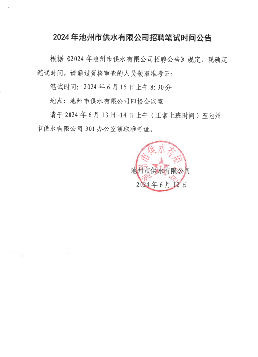 | 2024年池州市供水有限公司招聘筆試時間公告 | |