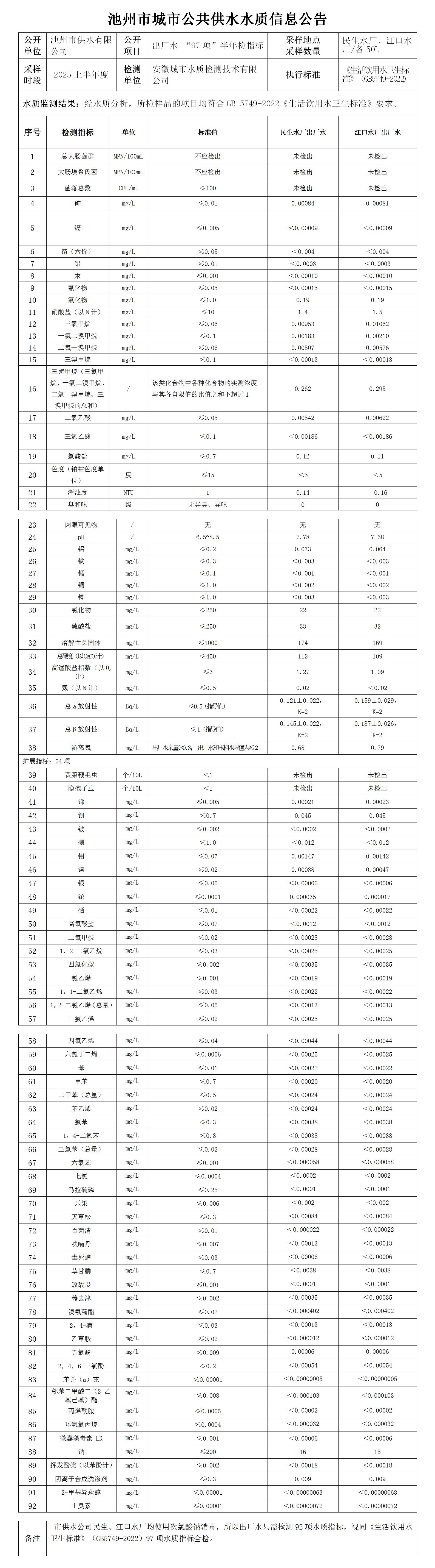 | 池州市城市供水水質信息公告出廠水“97項“2025年上半年全指標 | |