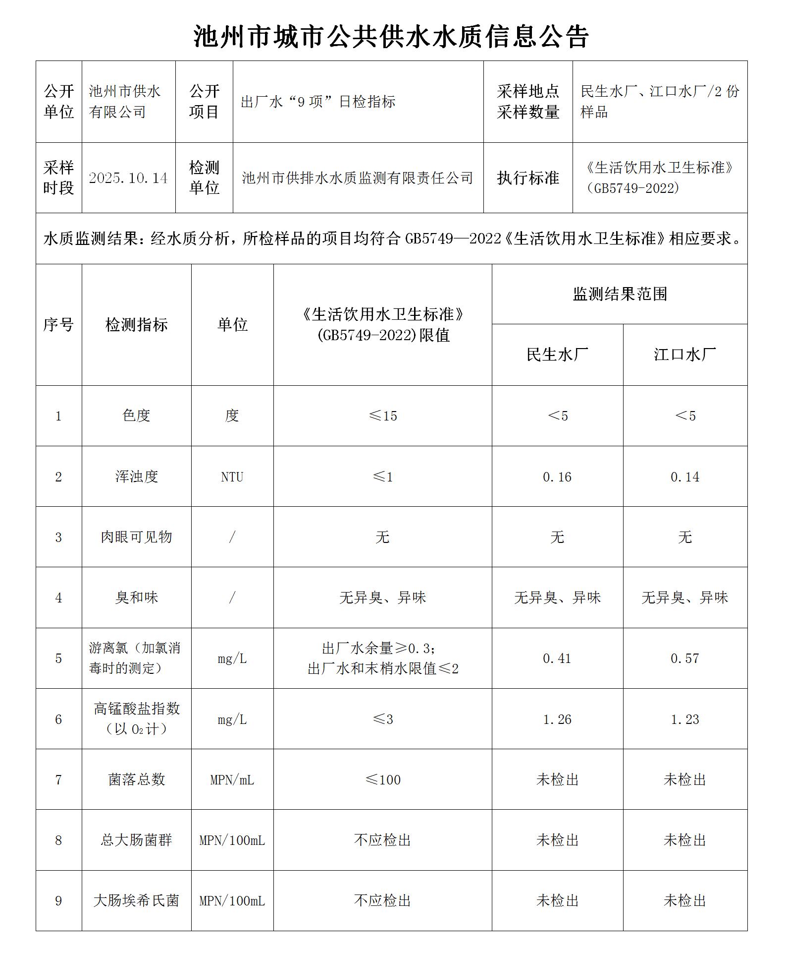 | 池州市城市公共供水水質信息公告出廠水“9項”日檢指標20251014 | |