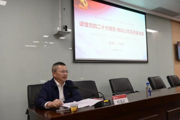 公司黨支部書記葉道正以《讀懂黨的二十大報(bào)告 推動(dòng)公司高質(zhì)量發(fā)展》為題,按照學(xué)原文、悟原理、知原義的學(xué)習(xí)要求,圍繞用“心”讀懂二十大報(bào)告中的關(guān)鍵詞、用“功”把握二十大報(bào)告中的核心要義、用“智”領(lǐng)悟二十大報(bào)告中的精神實(shí)質(zhì)、用“力”踐行二十大報(bào)告中的發(fā)展理念四個(gè)方面內(nèi)容對(duì)公司全體黨員進(jìn)行解讀闡述。