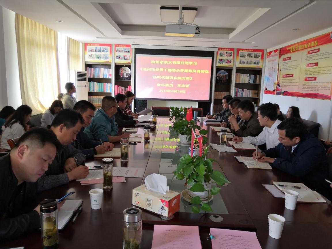 2018年4月18日,池州市供水有限公司黨支部組織學(xué)習(xí)《中國共產(chǎn)黨廉潔自律準(zhǔn)則》、《中國共產(chǎn)黨紀(jì)律處分條例》、《池州市黨員干部帶頭開展移風(fēng)易俗弘揚(yáng)時代新風(fēng)實(shí)施方案》,全體黨員及入黨積極分子參加了本次學(xué)習(xí)。