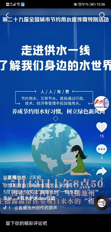 抖音直播   為了讓更多不能來現(xiàn)場實地參觀的市民們能近距離觀看制水過程,公司還邀請了今日頭條、安徽新聞網(wǎng)工作人員,利用抖音直播方式實現(xiàn)實時直播“民生水廠開放日”活動。這一線上直播方式是當(dāng)下民眾的新寵,他們可以足不出戶就能親臨現(xiàn)場,甚至比在場觀眾更能看到細(xì)微和整體。今日頭條“直播池州”和安徽新聞“今日池州”兩大直播平臺受眾多、影響大,傳播速度快,是池州本地最受歡迎的網(wǎng)絡(luò)媒體。本次線上直播共吸引受眾1.5萬余人現(xiàn)場觀看、點評,大大提升了池州供水知名度和“節(jié)水意識”的傳播。