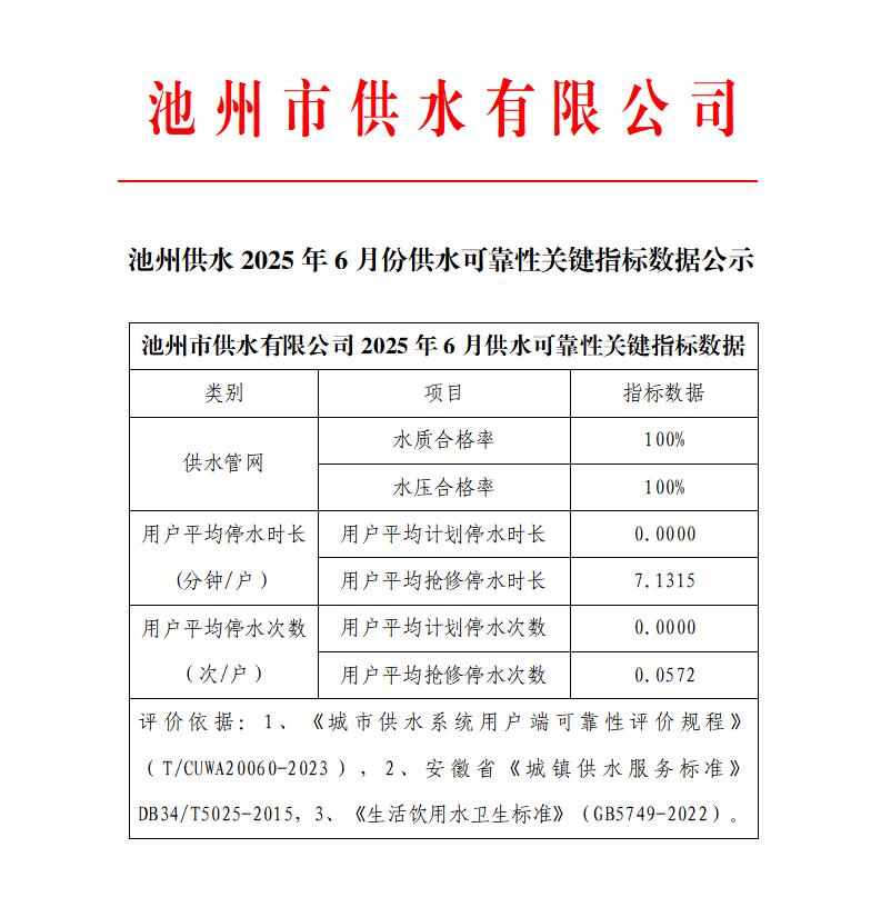 | 池州供水2025年6月份供水可靠性關鍵指標數據公示 | |